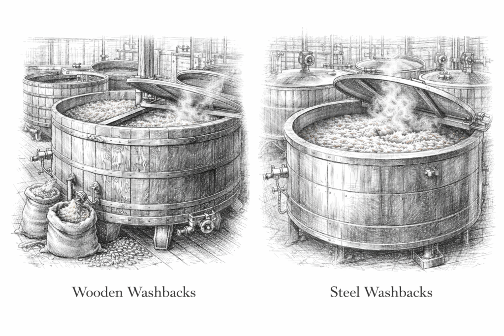 Wort is transferred to fermentation tanks called washbacks. Yeast is added. Sugar becomes alcohol.